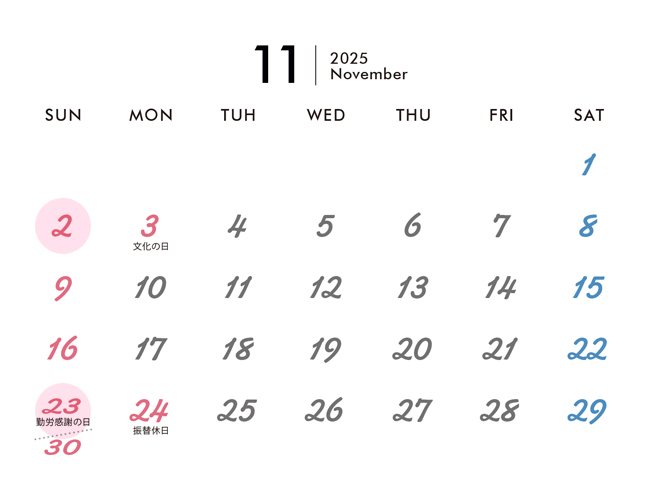 | 休業日 | 11月2日(日)、23日(日) お盆・年末年始 ※12月の予定は確定次第掲載いたします。 |